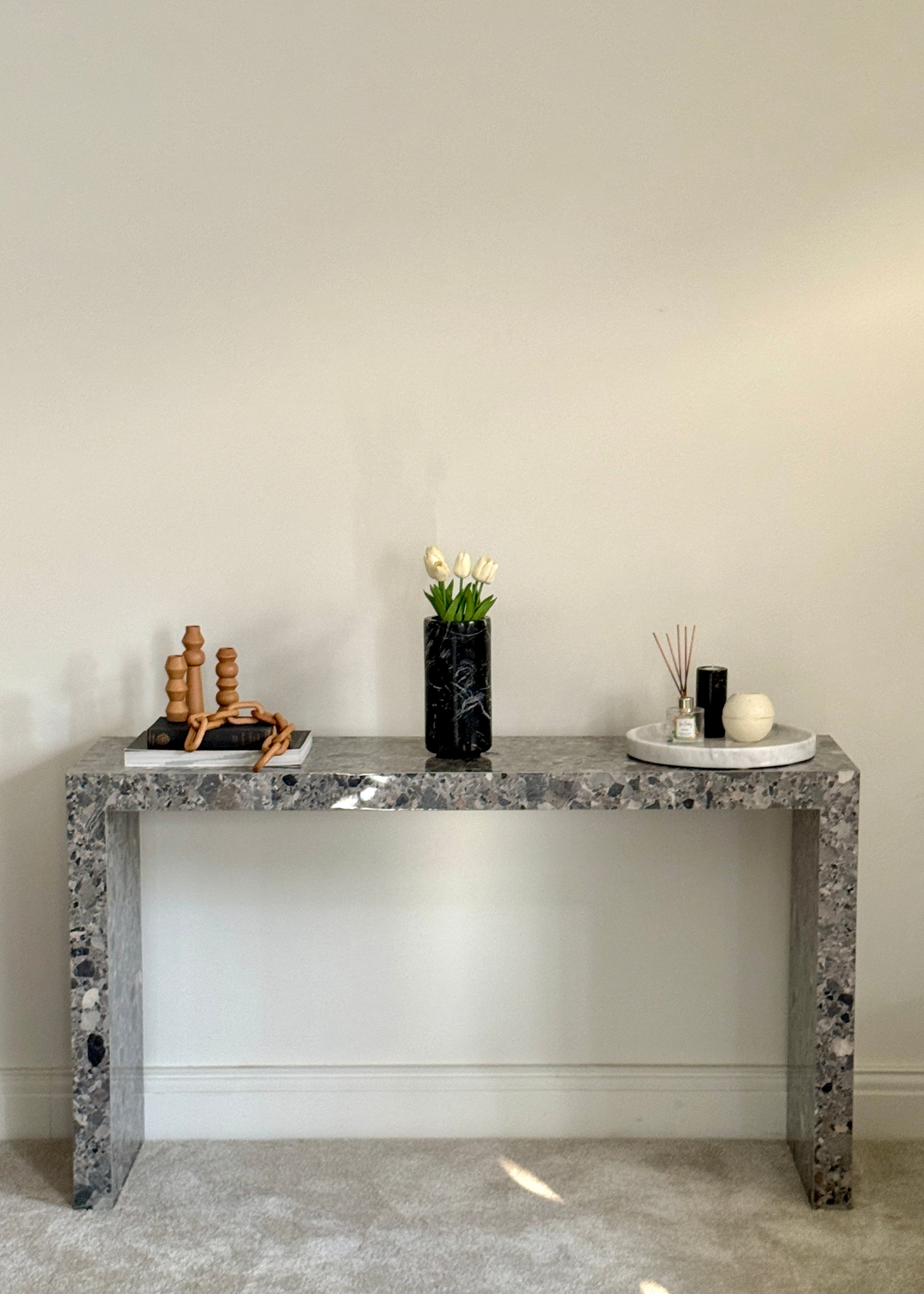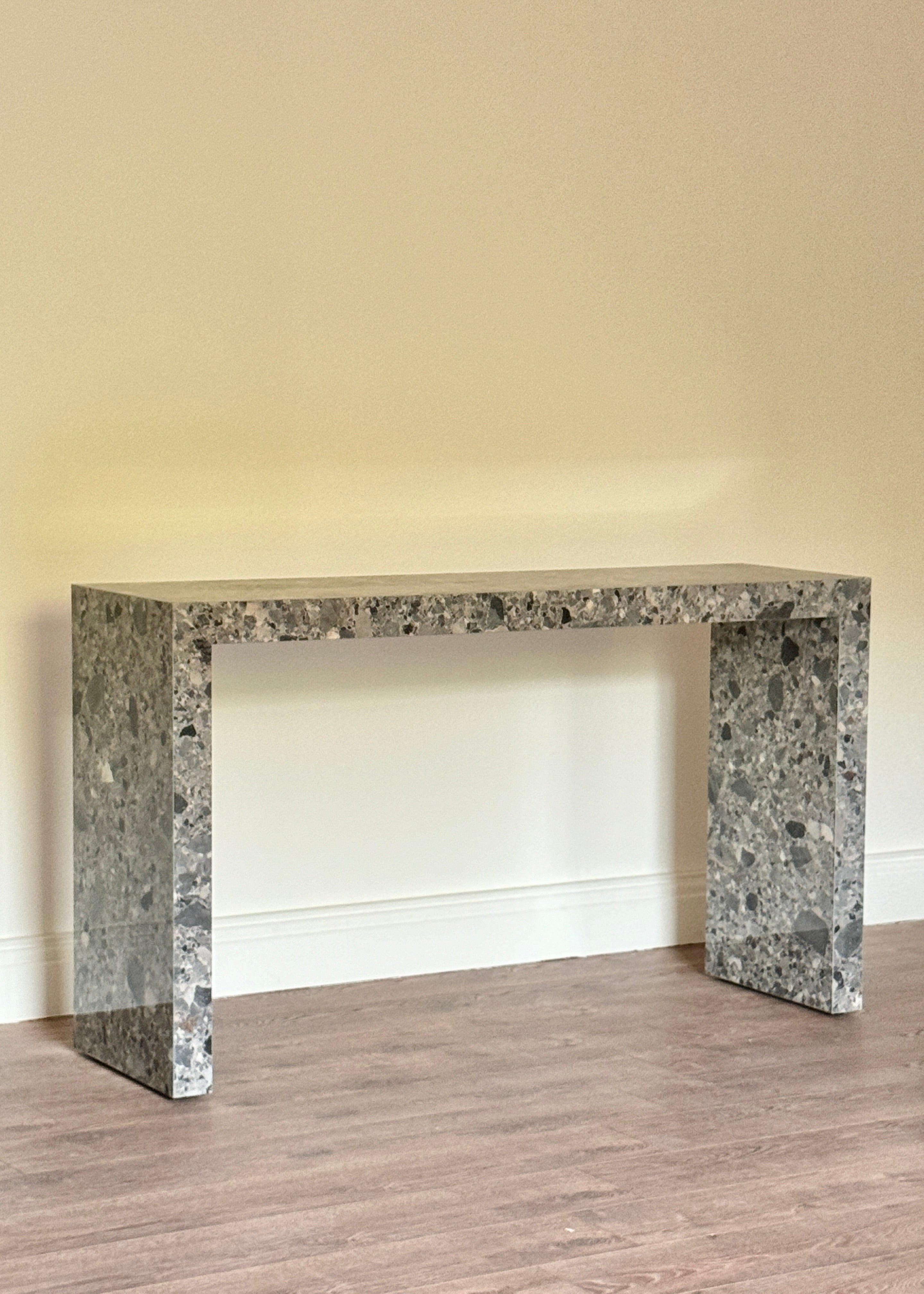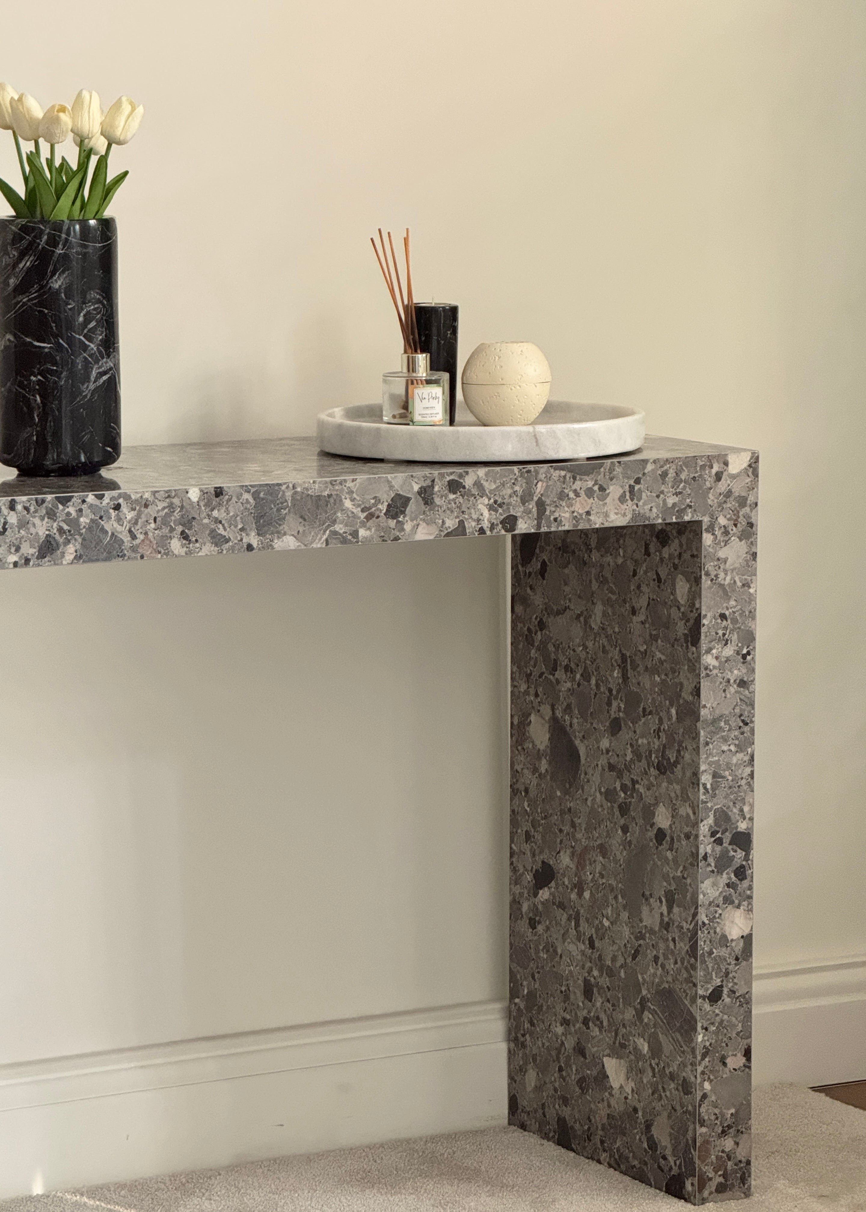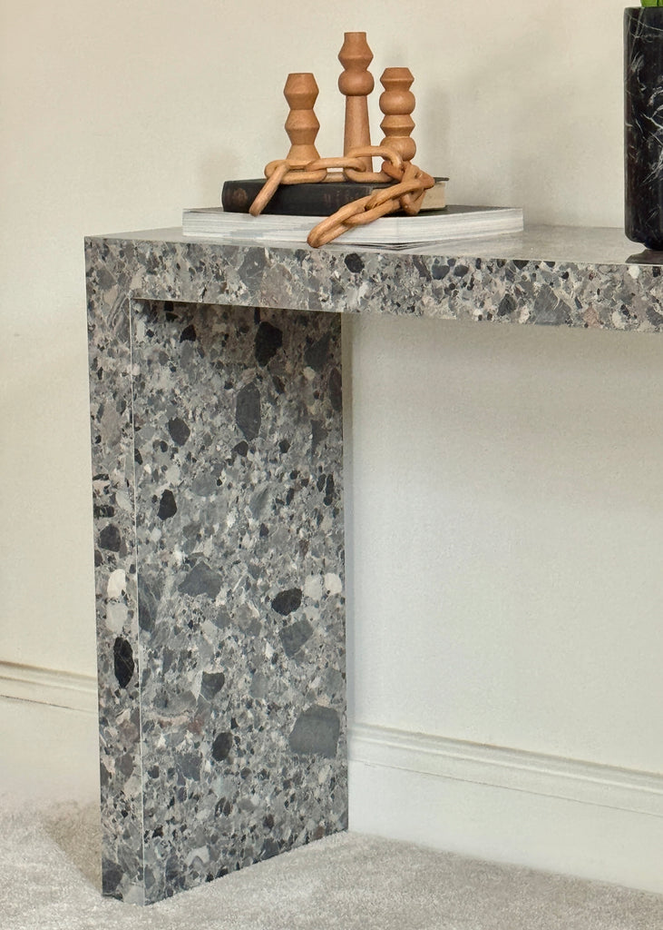 Elevate your home decor with our Marble-Like Console. Perfect for displaying your favorite items or placing behind a sofa for added style. Its light weight makes it easy to move and versatile for any room.