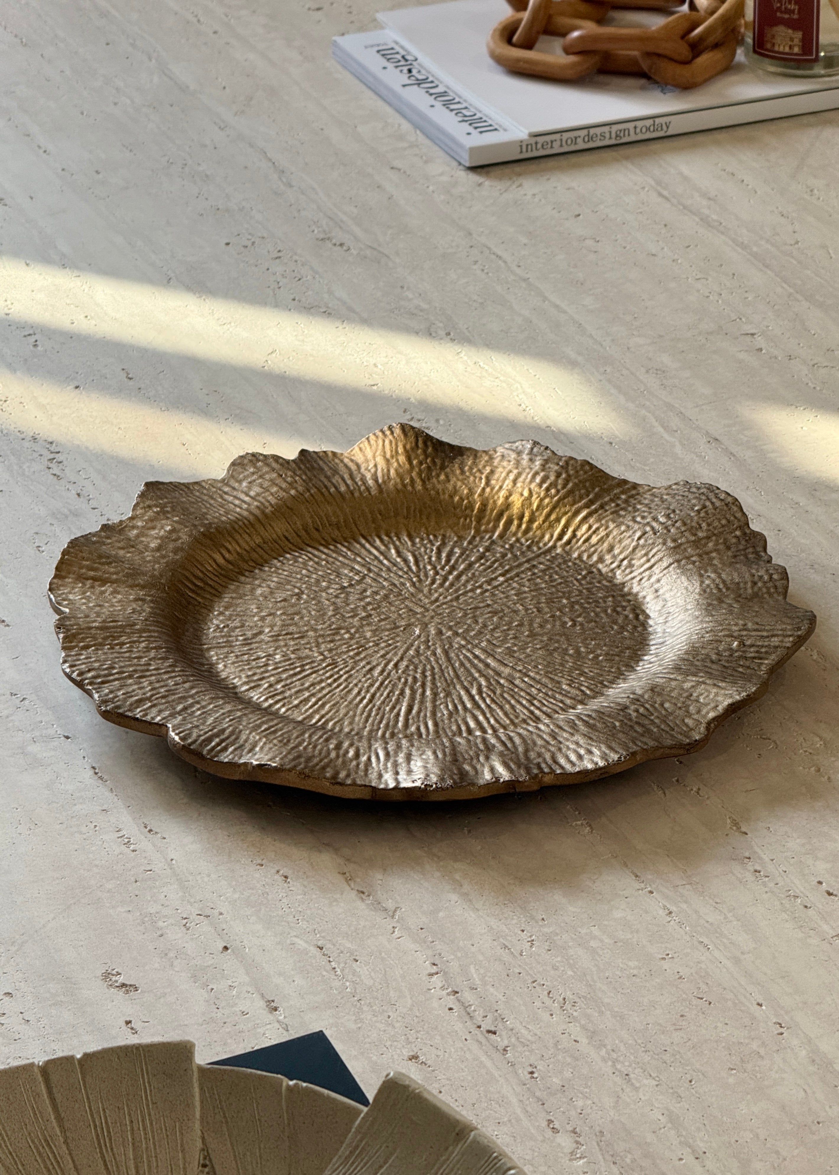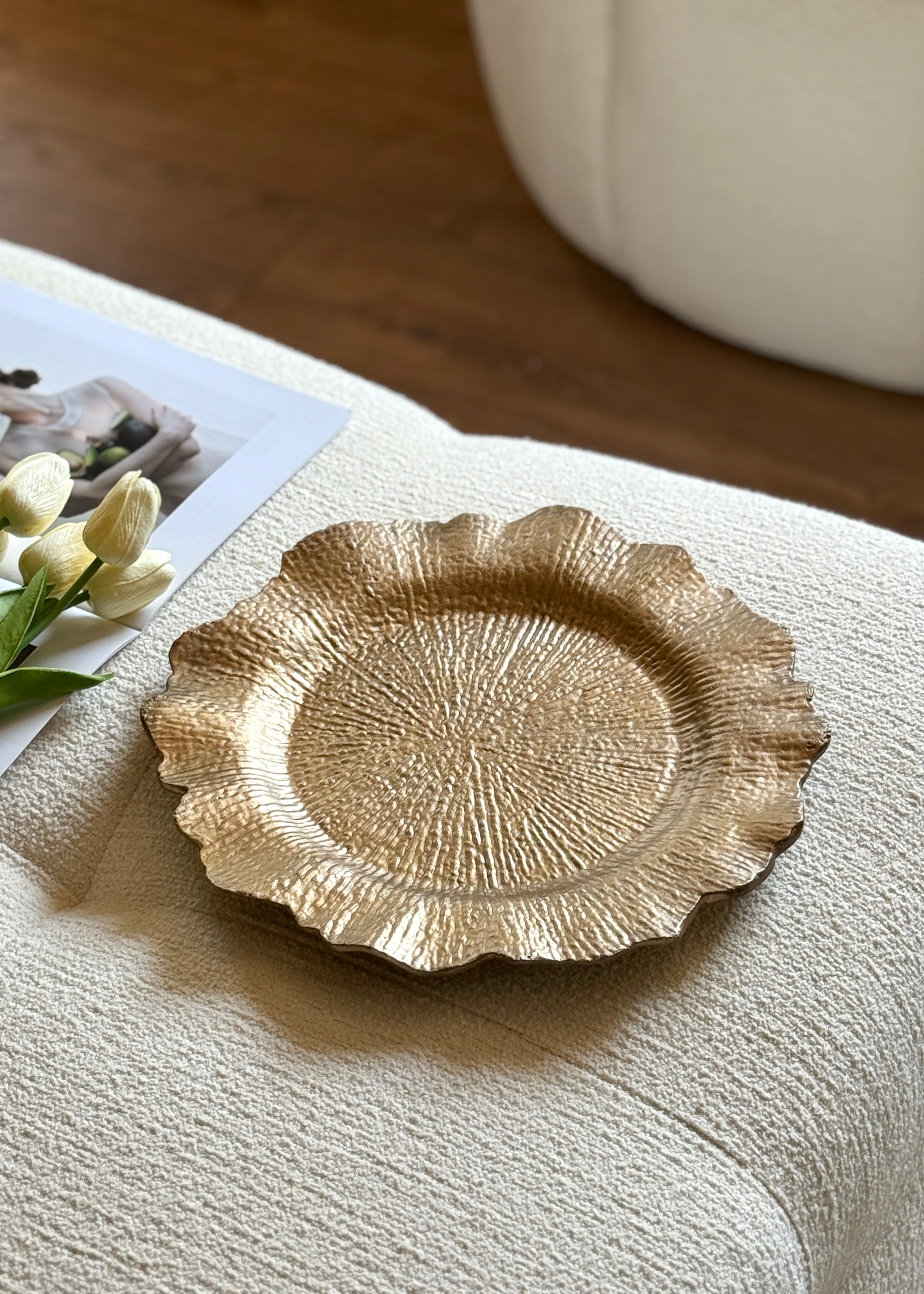 Elevate your tabletop styling with this exquisite Golden Ruffle Decorative Plate. Featuring a textured sunburst pattern and organically wavy edges, it brings a touch of artful luxury to any setting.