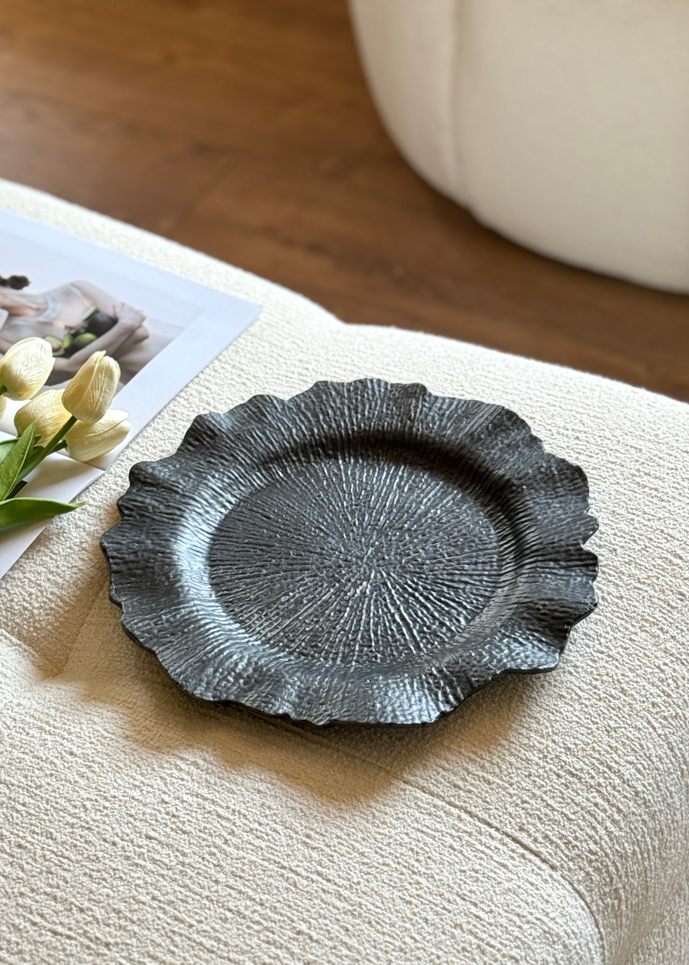 Elevate your tabletop styling with this exquisite Golden Ruffle Decorative Plate. Featuring a textured sunburst pattern and organically wavy edges, it brings a touch of artful luxury to any setting.