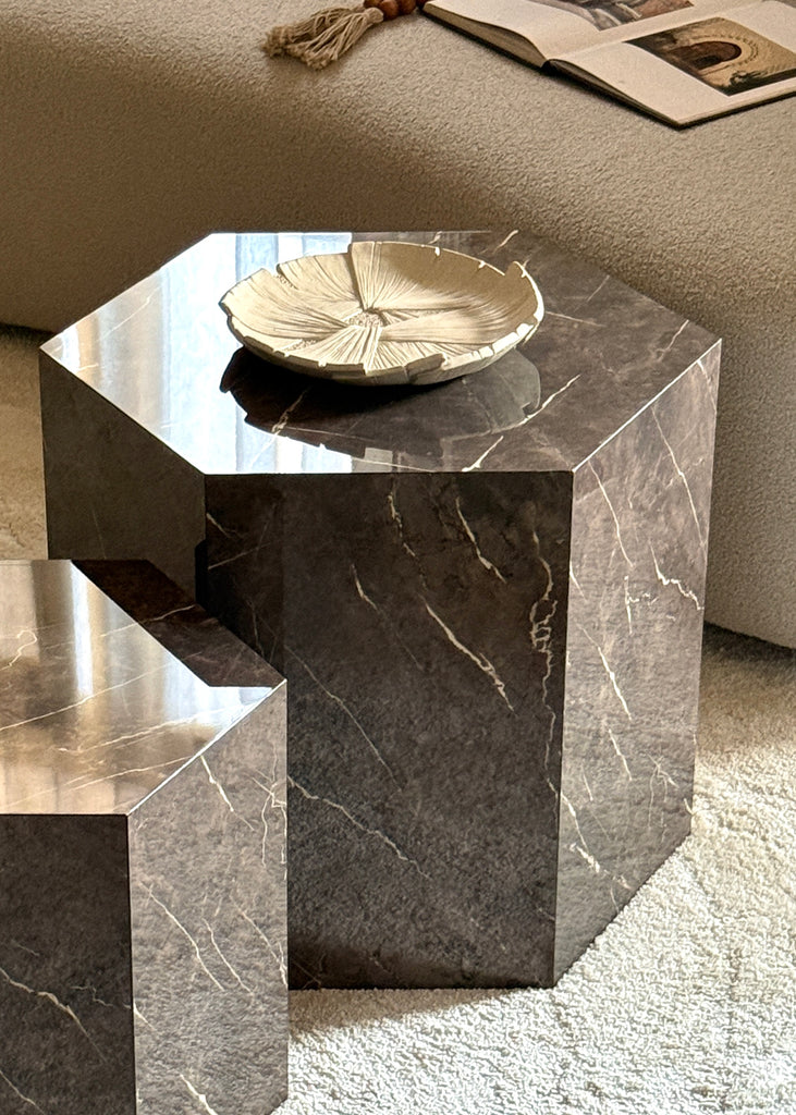 Discover the elegance and simplicity of these hexagonal tables.