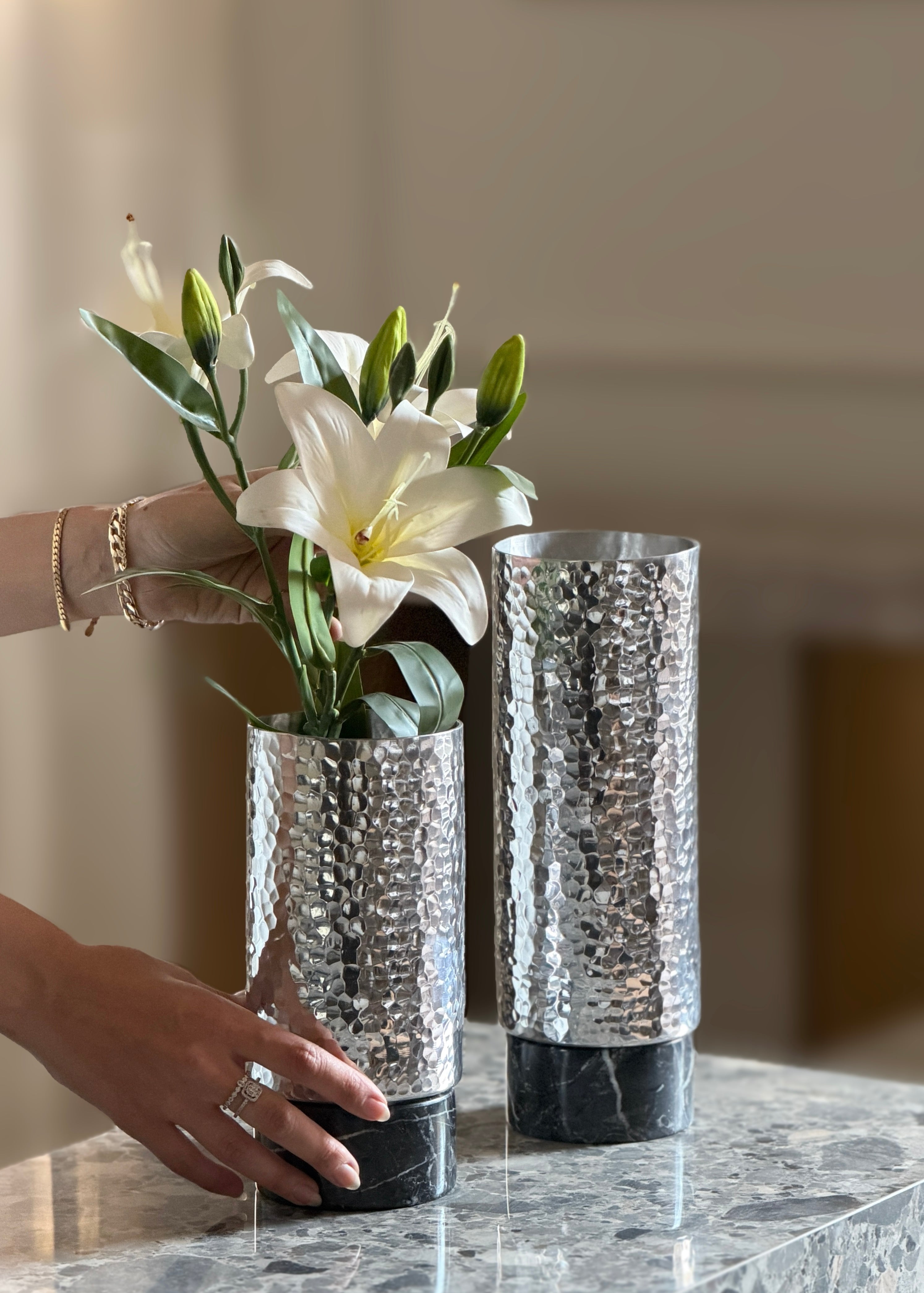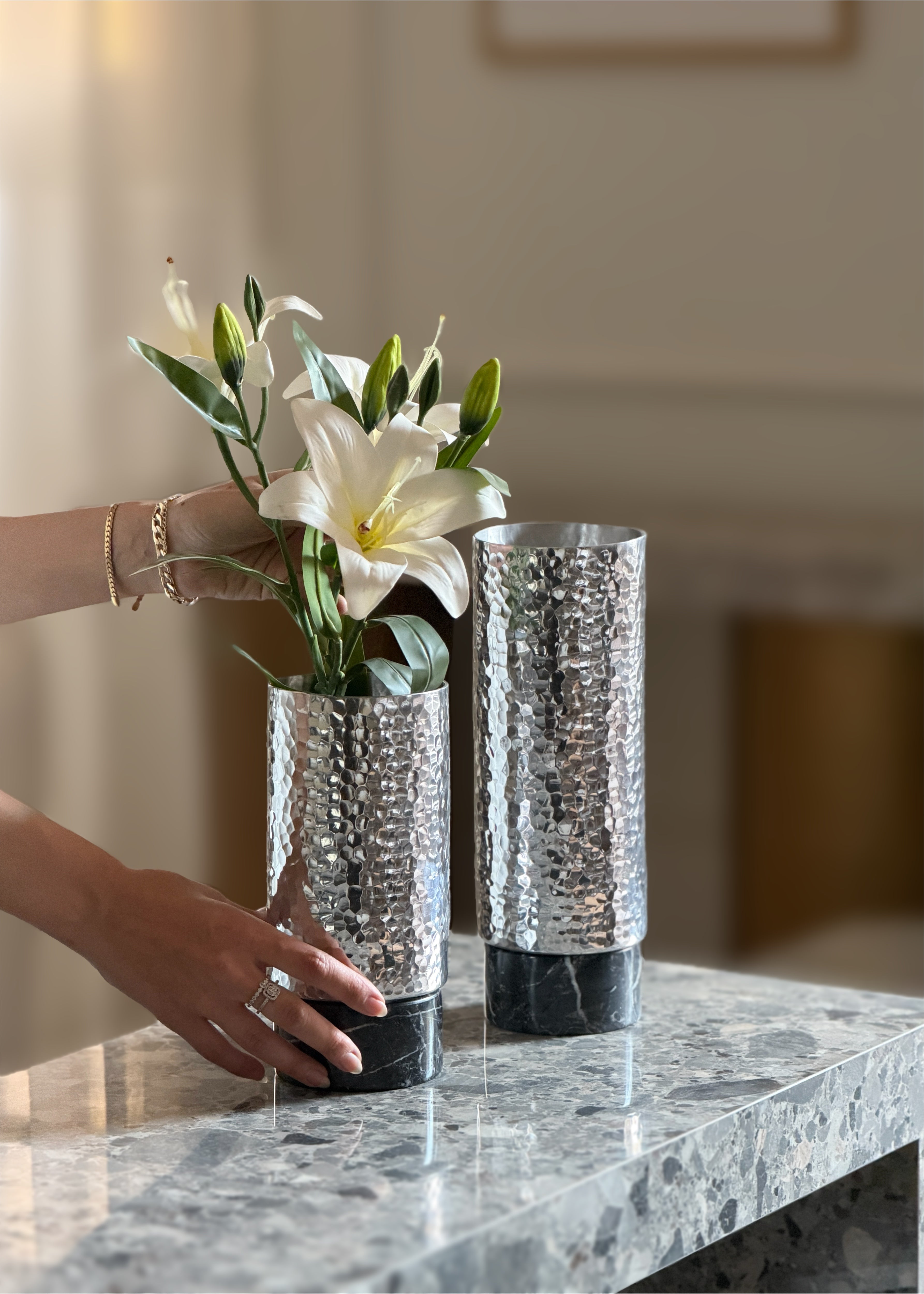 The Element Vase Set brings together warm steel tones with a solid marble base, creating a statement piece that feels both modern and timeless.