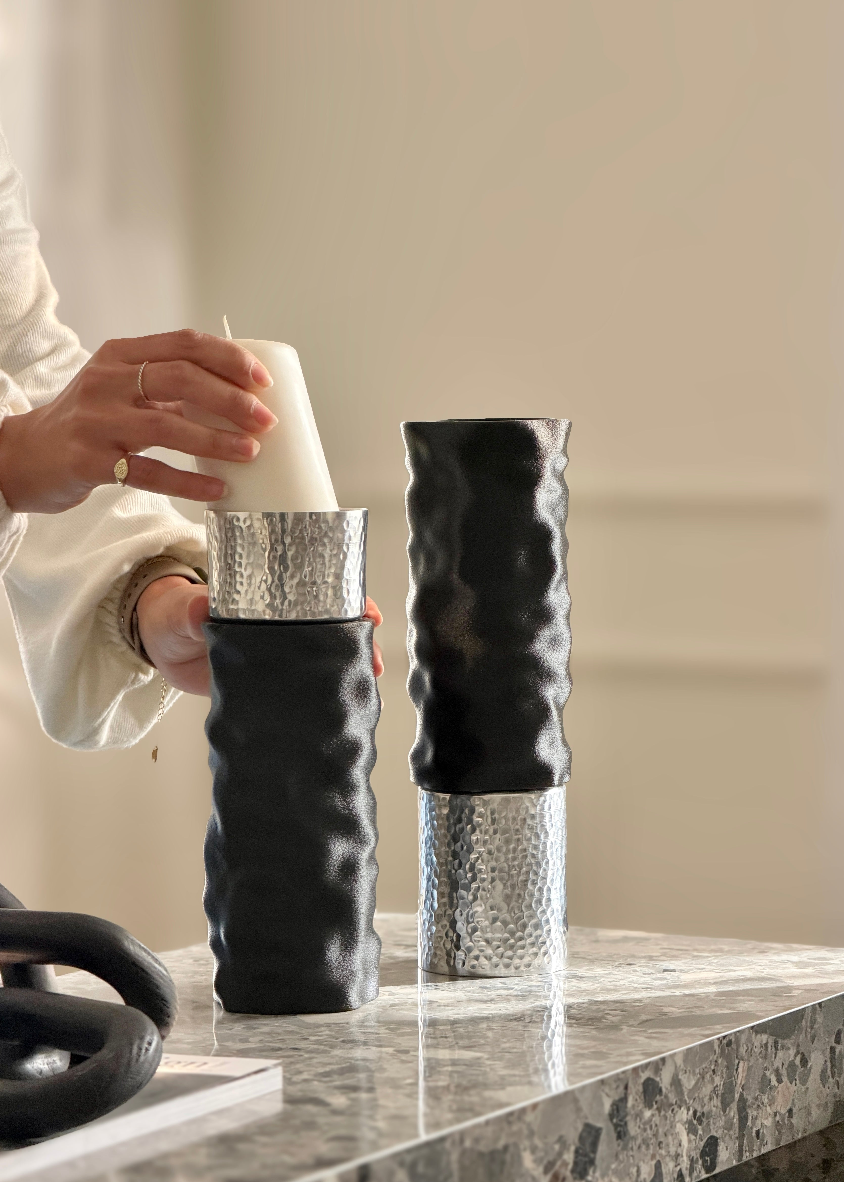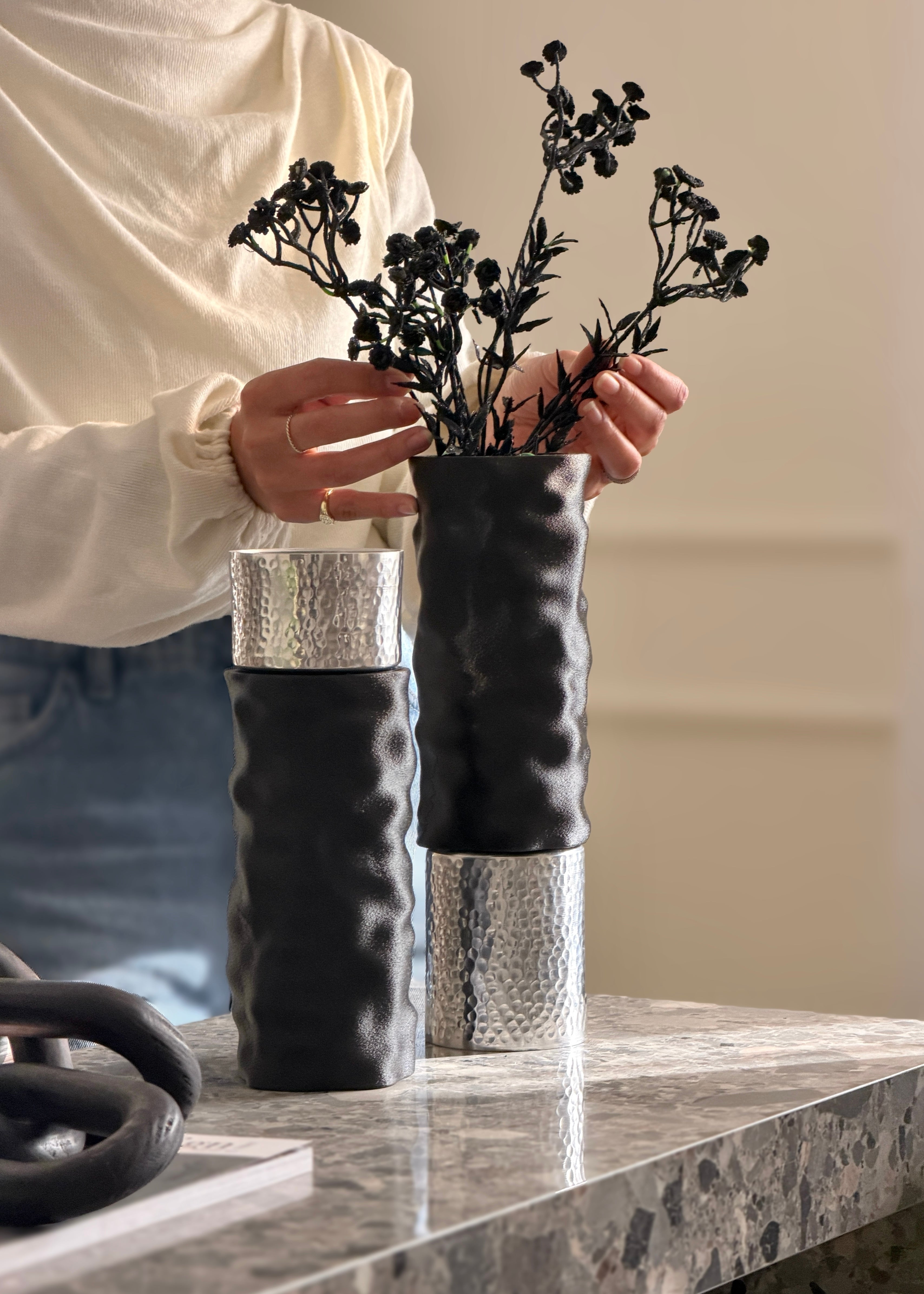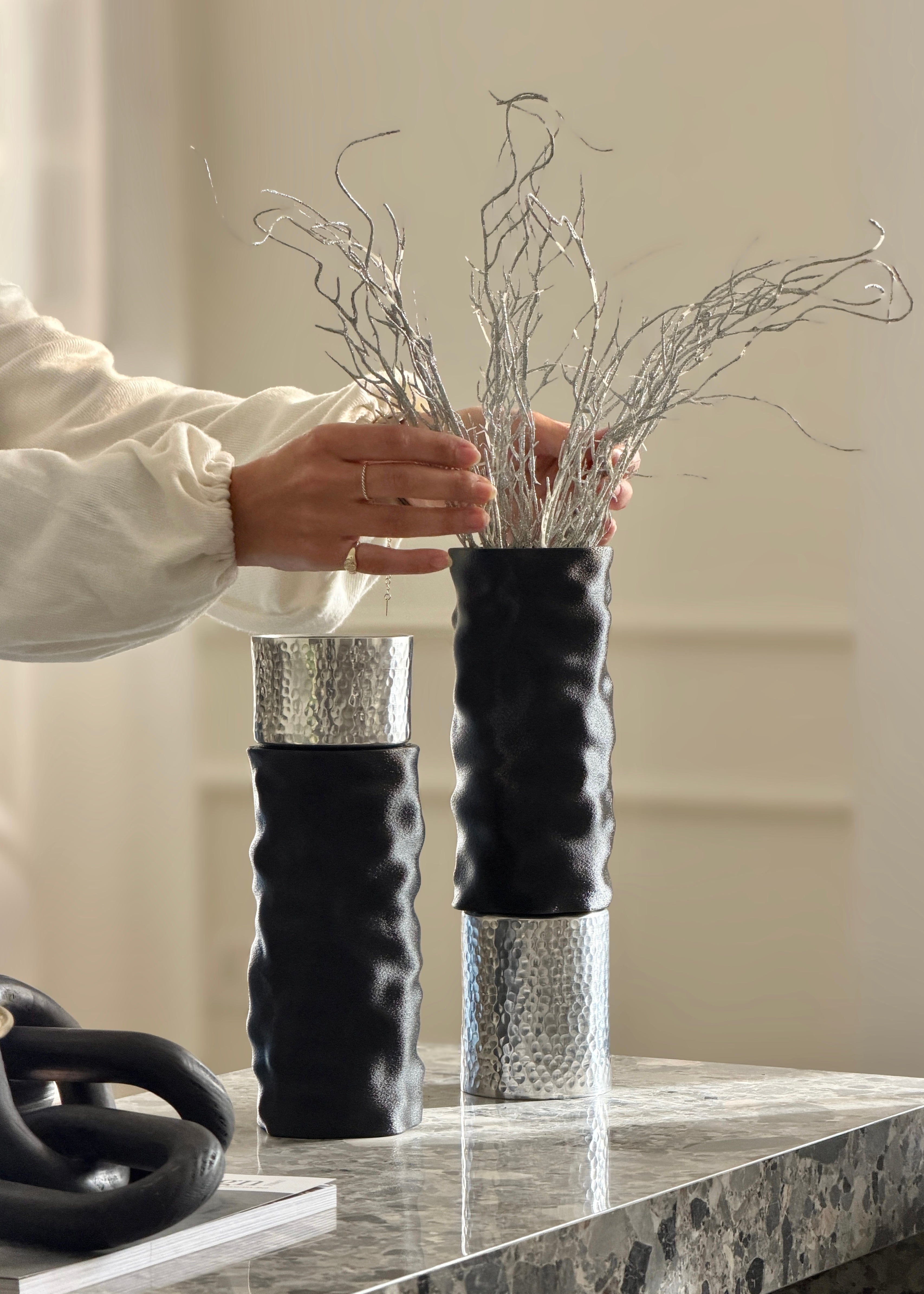 Featuring a textured black body paired with a hammered metallic accent, this piece adds depth, contrast, and a modern sculptural feel to any space. Simply flip it to switch between looks, making it ideal for consoles, shelves, coffee tables, or side tables.